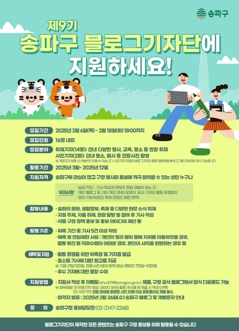 먼저, ‘제9기 송파구 블로그기자단’은 송파구에 관심 있는 만 19세 이상 대한민국 국민 누구나 지원할 수 있으며, 16명을 선발한다. 특히, 올해는 송파의 아름다운 모습을 사진으로 소개할 사진기자도 모집한다.