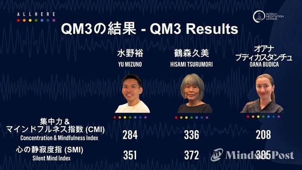챌린지 참가자인 오아나 부디카스탄쿠(Oana Budicastancu), 츠루모리 히사미(Hisami Tsurumori), 미즈노 유(Yu Mizuno)씨 중 츠루모리씨가 가장 높은 QM3™ 점수를 기록했다. 그녀는 "20년 전 질병에 걸린 일을 계기로 명상을 시작한 뒤 매일 수행해왔다"면서 "삶에서 스트레스와 불안을 느끼는 분에게 명상이 내게 그랬듯 내적 평화를 가져다주길 바란다"고 전했다.