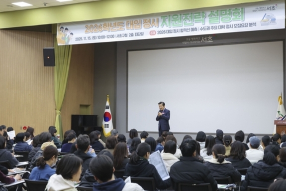 서울 서초구(구청장 전성수)는 수능 이틀 뒤인 11월 15일(토) 오전 10시 서초구청 2층 대강당에서 '2026학년도 대입 정시 지원전략 설명회'를 개최했다. 이번 설명회는 2026학년도 수능 직후 가장 먼저 열린 서울시 자치구 주관 입시 설명회로, 정시 전략을 미리 세우려는 수험생과 학부모 250여 명이 참석해 높은 관심을 보였다. 설명회는 국내 최고 수준의 입시 전문가 2명이 120분간 핵심 전략을 전하는 '올인원(All-in-One)' 특강으로 진행됐다. 1부에서는 임성호 종로학원 대표이사가 ▲2026 정시 합격선 예측 ▲의대 정원 축소에 따른 '사탐런'(이과생의 사회탐구 응시) 변수 ▲무전공 선발 확대의 파급효과 등을 분석하며 수험생들에게 현실적인 전략을 제시했다. 2부에서는 장문성 종로학력개발원장이 ▲대입 일정 체크리스트 ▲수도권 주요 대학 정시 모집요강 ▲경쟁률 전망 등을 짚으며 실전형 지원전략을 안내했다. 설명회 종료 후에는 구청 5층 대회의실에서 '1:1 가채점 컨설팅'이 마련돼 수험생 개별 점수 분석과 맞춤형 전략 상담도 진행됐다. 이어 18일부터 12월 말까지는 당일 참석이 어려웠던 수험생·학부모 400명을 대상으로 '1:1 맞춤형 정시상