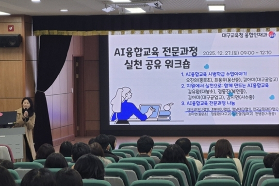 대구시교육청은 12월 27일(토) 오전 9시, 대구인공지능교육센터 시청각실에서 'AI융합교육 전문과정' 실천 공유 워크숍을 운영했다. 'AI융합교육 전문과정'은 교과 수업과 연계한 AI융합교육을 학교 현장에 적용할 수 있는 전문성을 기르기 위해, 대구시교육청이 교육대학원과 연계해 운영하는 교원 대상 전문과정이다. 이번 워크숍은 교육대학원 연계 AI융합교육 전문과정 운영 성과를 학교 현장으로 환류하고, 재학생과 졸업생 교원 간 실천 경험을 공유해 AI융합교육의 지속 가능한 확산 방안을 모색하기 위해 마련됐다. 이날 워크숍에는 AI융합교육 전문과정 재학 및 졸업 교원 224명이 참석했으며, 교육대학원 연계 AI융합교육 시범학급 운영 사례를 중심으로 실제 교실 수업에서의 적용 경험을 공유했다. 또 학교급별 AI융합수업 실천 사례를 소개하고, 학교 현장에서의 적용 가능성과 확산 방안에 대해 토의했다. 특히, 개인 교원의 실천을 공동의 성과로 확장하는 방안과 학교 현장에서 AI융합교육 실천을 가로막는 요인, 재학생-졸업생 간 협력을 통한 지속 가능한 실천 구조 마련 등 현장 중심의 논의가 이루어졌다. 대구시교육청 관계자는 "이번 워크숍을 통해 재학생-졸업생 교원 간